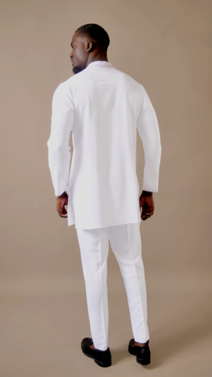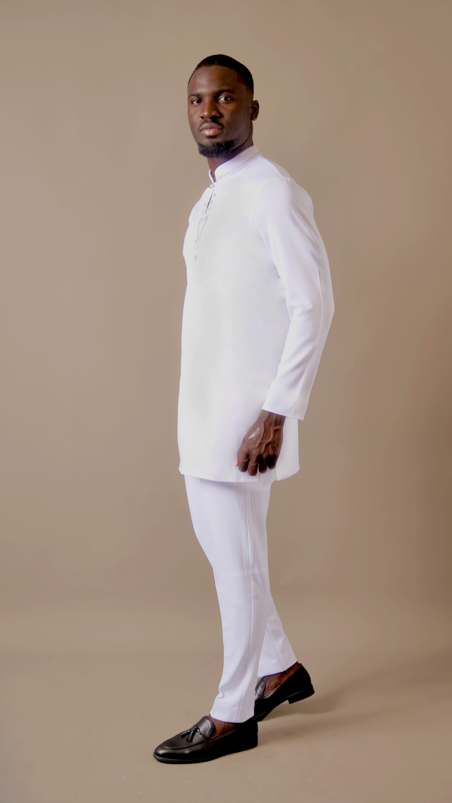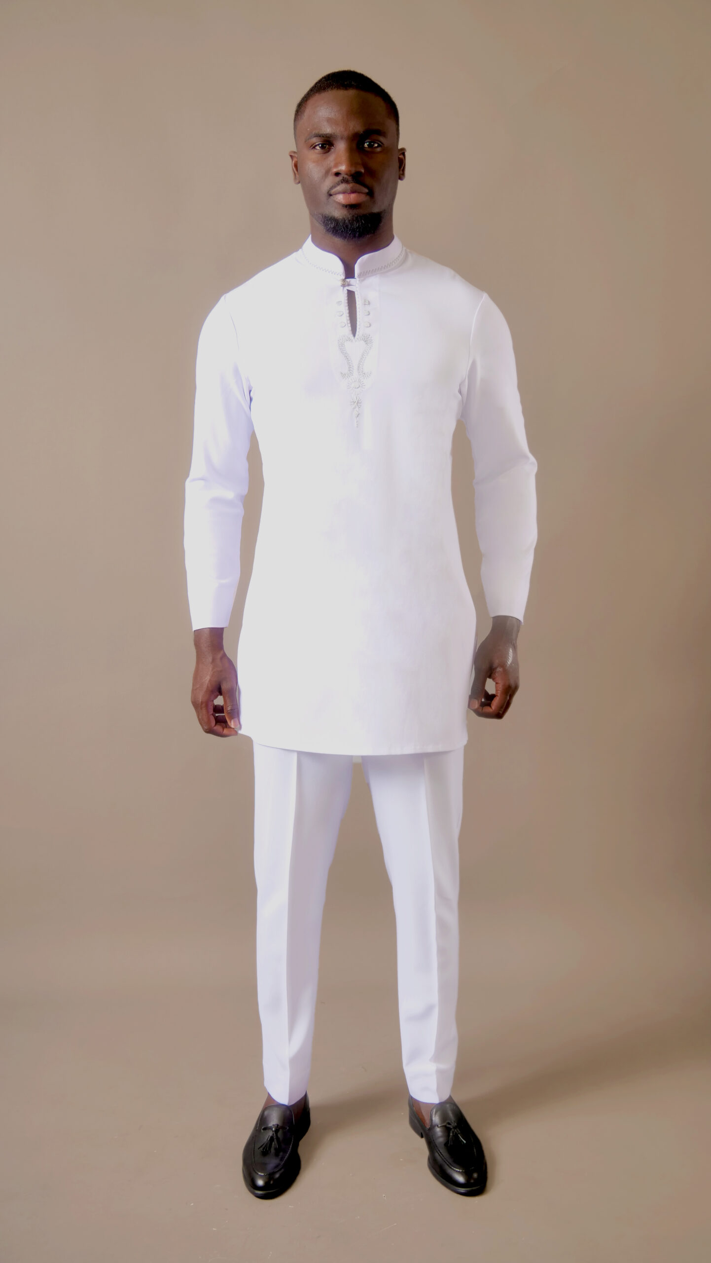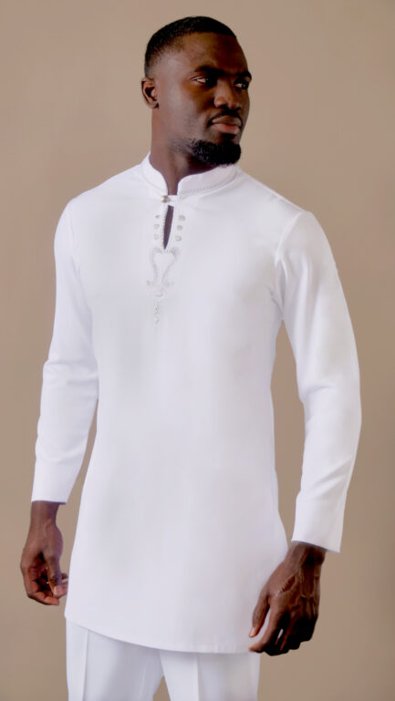 The traditional tunic Kaftan with hand embroidery around the neck dripping to the mid front.
