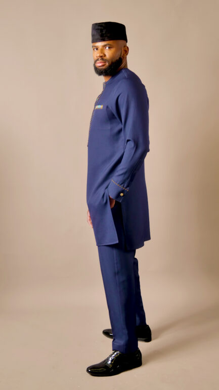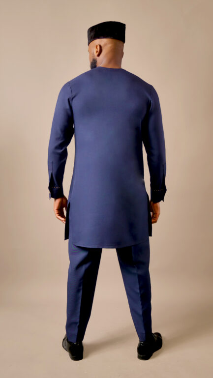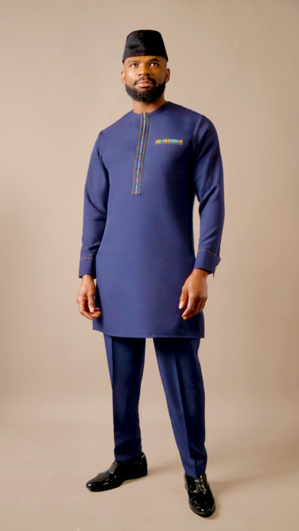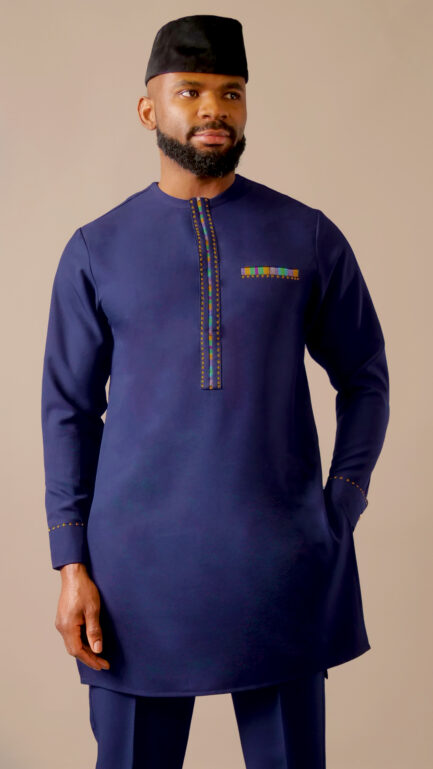 The dark blue kaftan with a twist of hand woven kente and cross hatched embroidery